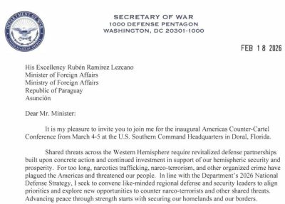 El secretario de Guerra de los EE.UU., Pete Hegseth, invitó al ministro de Relaciones Exteriores, Rubén Ramírez Lezcano, a participar de la “Conferencia Inaugural de las Américas para la lucha ...