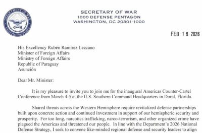 El secretario de Guerra de los EE.UU., Pete Hegseth, invitó al ministro de Relaciones Exteriores, Rubén Ramírez Lezcano, a participar de la “Conferencia Inaugural de las Américas para la lucha ...