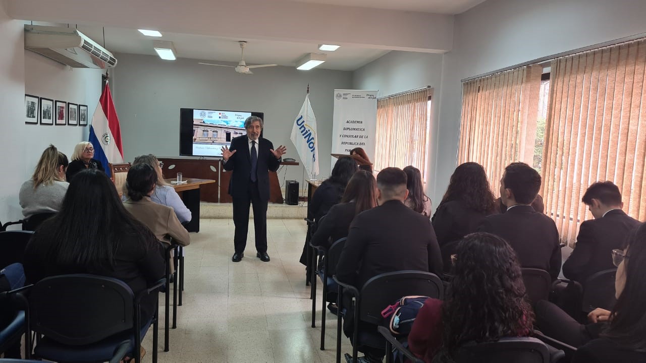 Alumnos de las Licenciaturas en Relaciones Internacionales y Comercio Exterior, de la Uninorte, visitaron la Academia Diplomática y Consular Carlos Antonio López, donde participaron de un coloquio destinado a presentar la Academia y el “Concurso Nacional de Oposición y Méritos para acceder al escalafón diplomático y consular en la categoría de Tercer Secretario”.