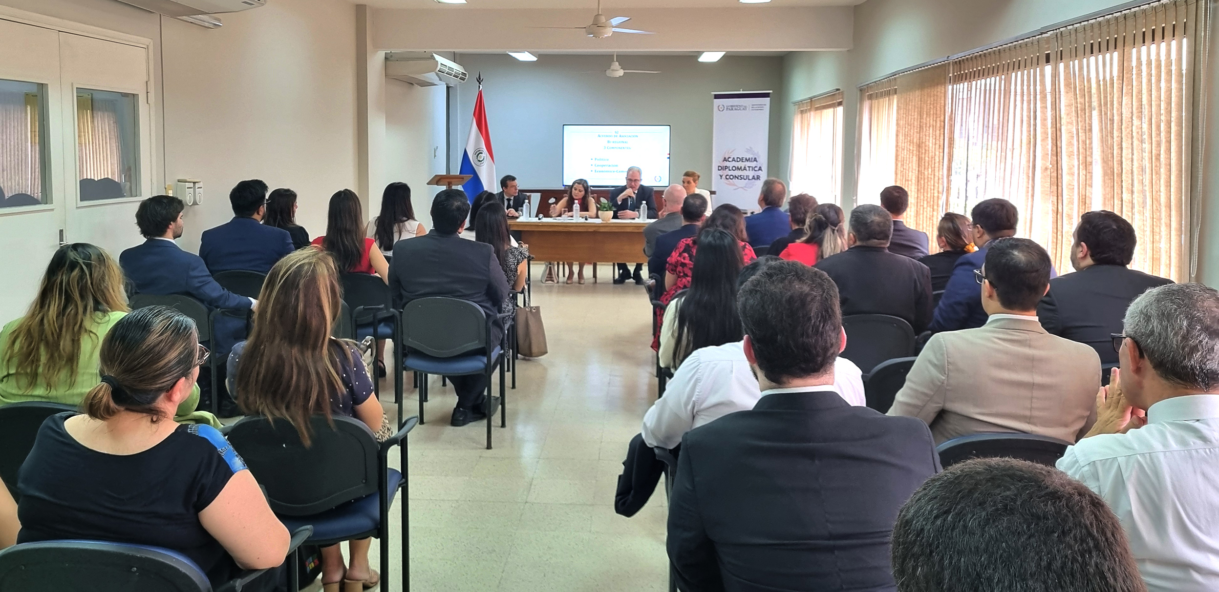 El evento se desarrolló en el Aula Magna de la Académica Diplomática y Consular y formó parte de la serie de actividades académicas que la institución desarrolla para el abordaje y análisis de diferentes temas del quehacer nacional e internacional, dirigidos a los funcionarios de la Cancillería paraguaya y en especial a los diplomáticos cursantes de las etapas de formación, perfeccionamiento y actualización.