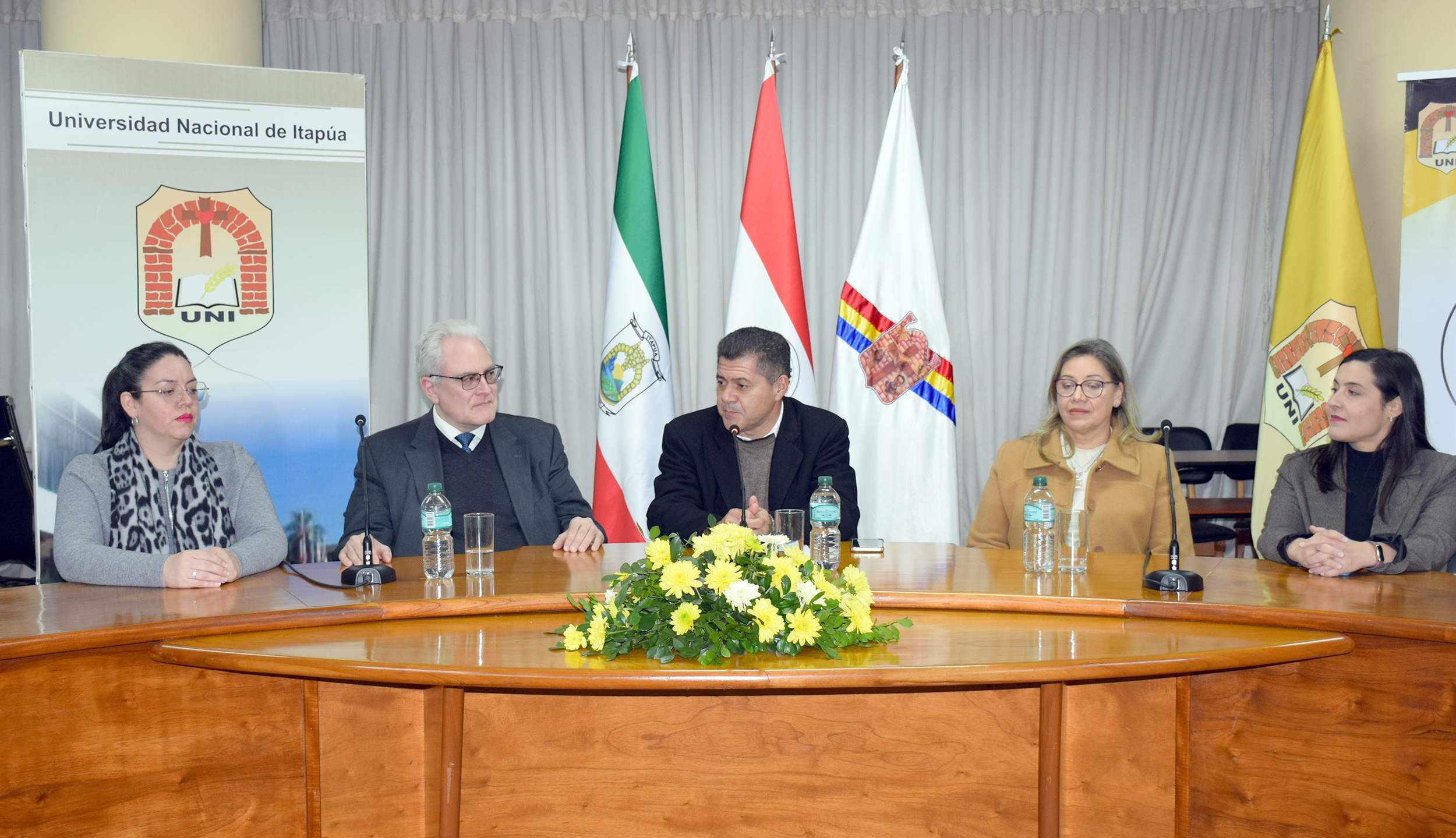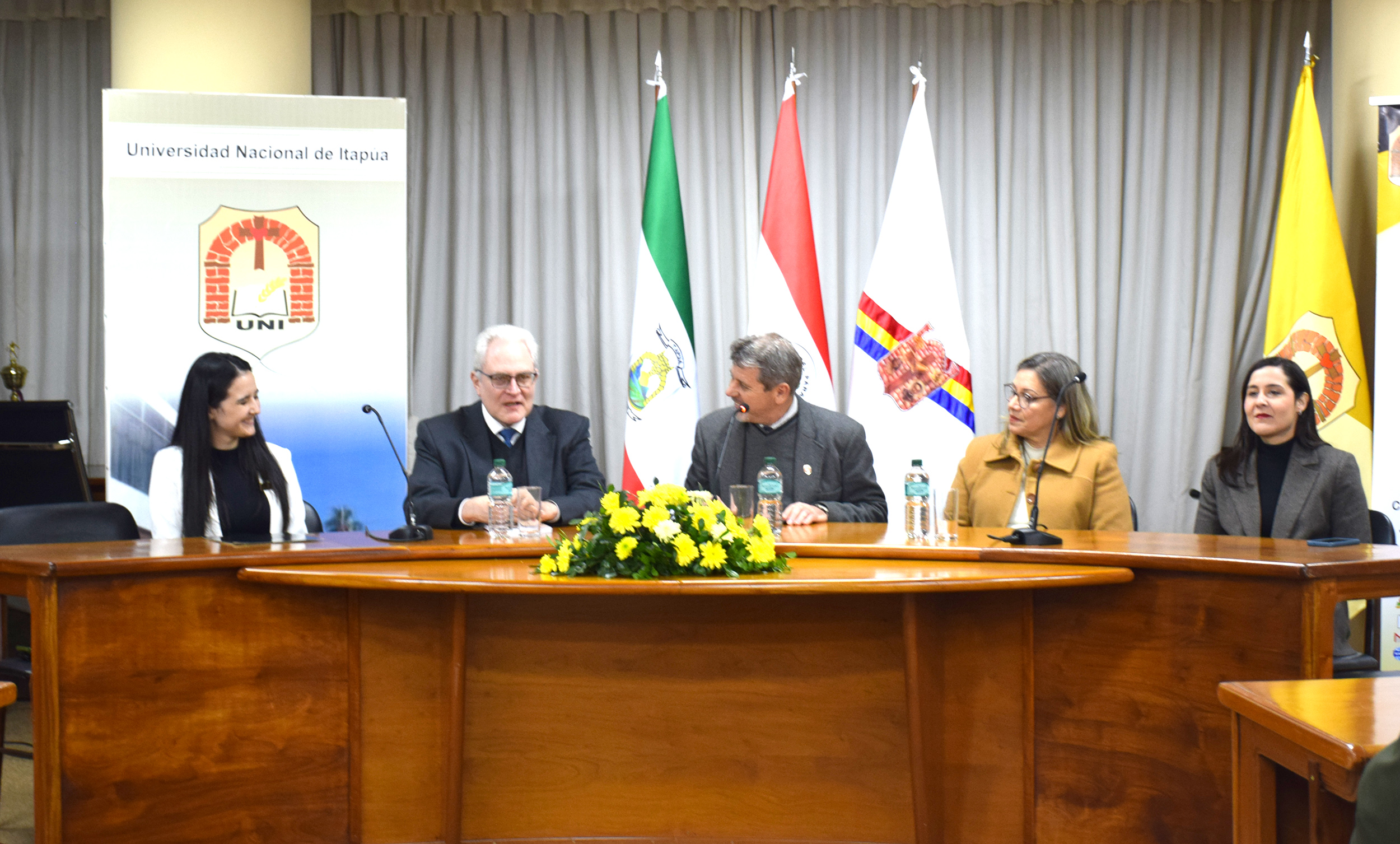 Estuvieron presentes las autoridades de la Universidad Nacional de Itapúa, encabezadas por el doctor Antonio Kierniezny Rovate, Decano de la Facultad de Humanidades, Ciencias Sociales y Cultura Guaraní, el doctor Dionisio Fleitas, vicedecano, la doctora Sintia Ortiz, Directora Académica, y la abogada Carmen Bogado, Directora del Departamento de Cooperación de la Universidad Nacional de Itapúa.