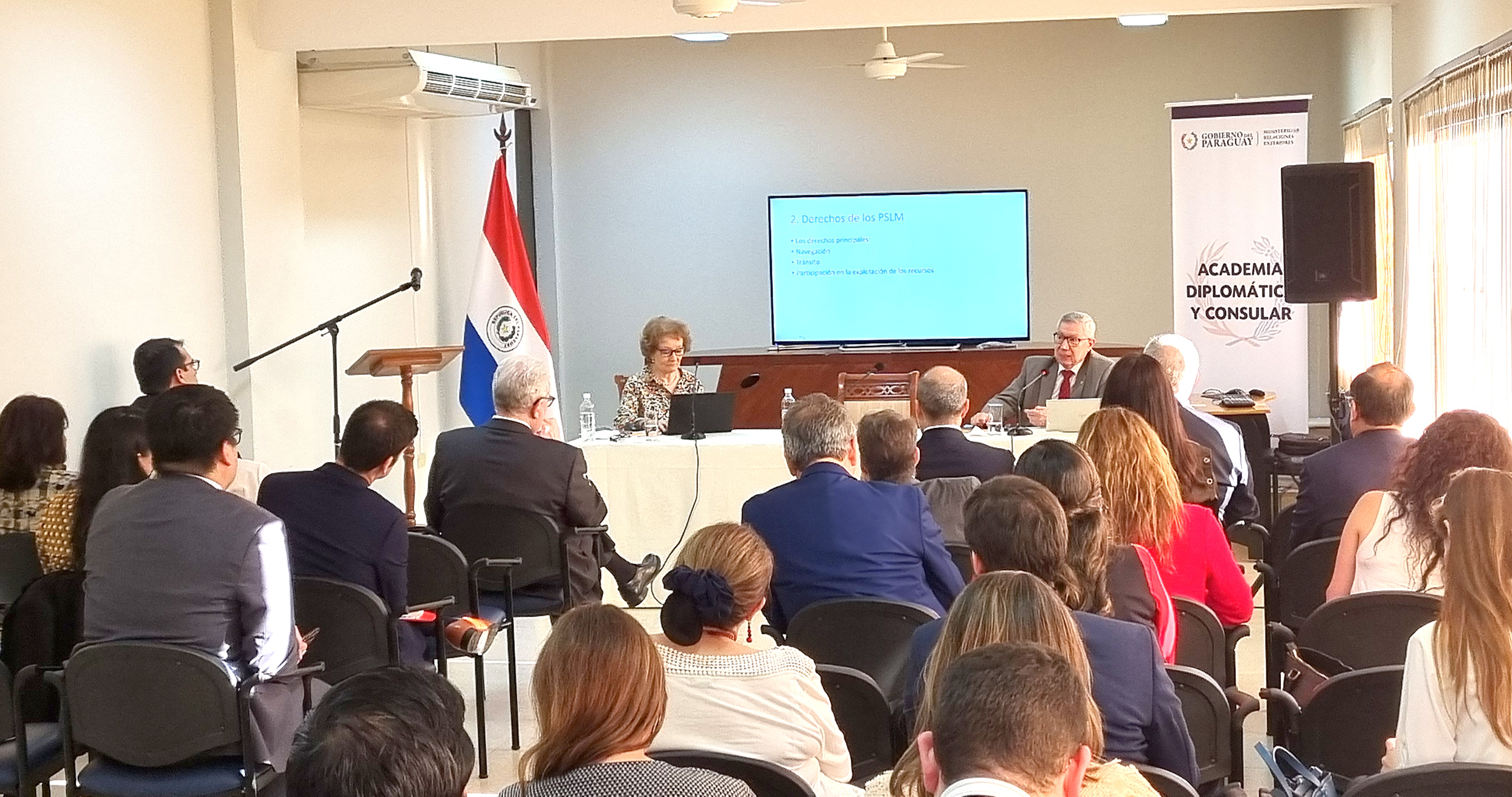 El embajador paraguayo, Oscar Cabello Sarubbi y la embajadora chilena, María Teresa Infante, ambos jueces del Tribunal Internacional del Mar, fueron expositores en el conversatorio sobre “La Convención sobre el Derecho del Mar. Derechos y oportunidades para los países sin litoral marítimo”, que se desarrolló en la Academia Diplomática y Consular.