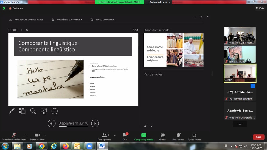 El 17 de mayo pasado, tuvo lugar la videoconferencia internacional “La interculturalidad y el fortalecimiento de los intereses comunes sur-sur”, organizada conjuntamente por la Embajada de la República del Paraguay en el Reino de Marruecos, la Academia Marroquí de Estudios Diplomáticos y la Academia Diplomática y Consular Carlos Antonio López.