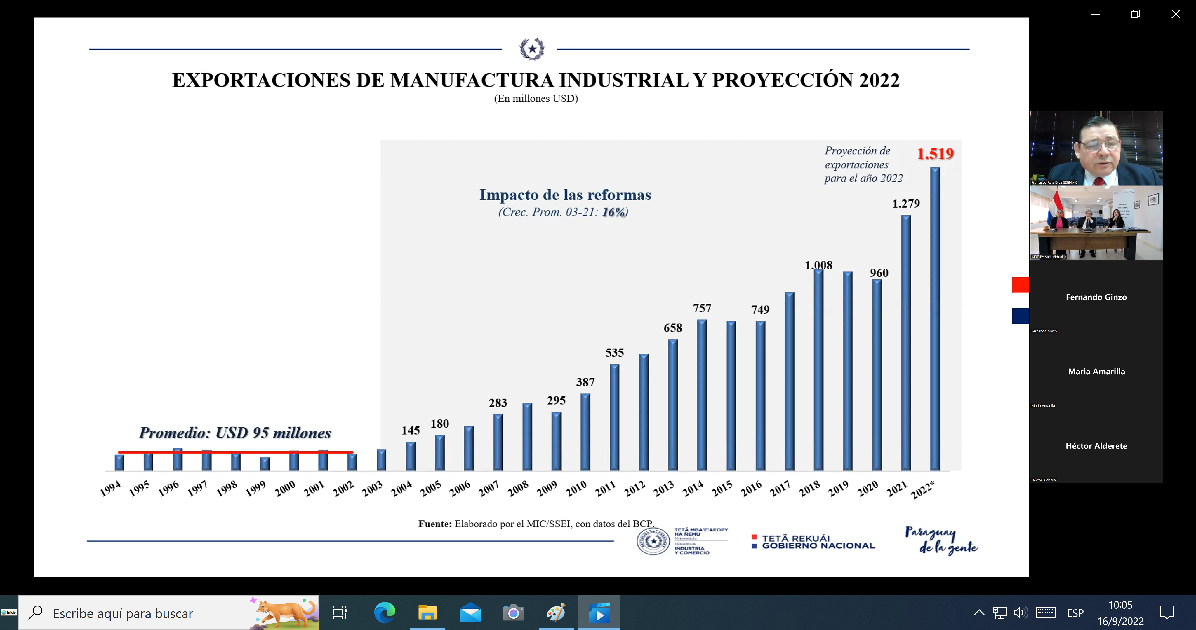 Durante su ponencia, el Viceministro Ruiz Díaz destacó el crecimiento exponencial de los índices de industrialización en el país, desde el año 2003, así como el rol central del régimen de maquila en dicho proceso. En ese sentido, señaló que las exportaciones paraguayas de productos industriales crecieron en un 843% del 2002 al 2022. Igualmente, recalcó la diversificación tanto de los productos manufacturados paraguayos, como de los destinos de exportación de los mismos.