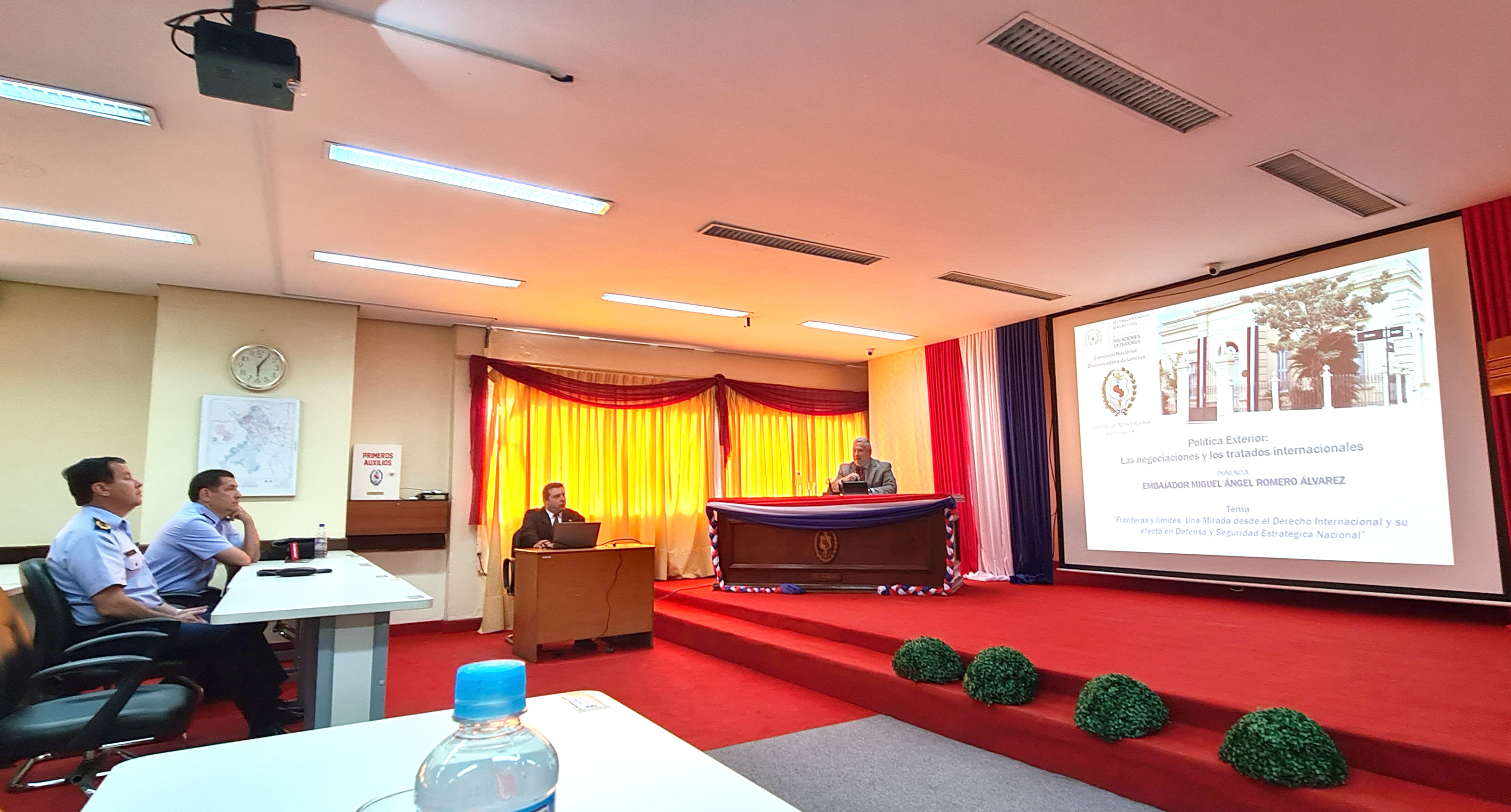 En el marco de la prosecución del Programa de Doctorado en Defensa, Desarrollo y Seguridad Estratégica Nacional del Instituto de Altos Estudios Estratégicos (IAEE) -segunda promoción- el embajador Miguel Ángel Romero Álvarez, en respuesta a una invitación y en su calidad de presidente de la Comisión Nacional Demarcadora de Límites (CNDL), brindó ayer una ponencia sobre el tema: “Fronteras y límites. Una Mirada desde el Derecho Internacional y su efecto en Defensa y Seguridad Estratégica Nacional”.