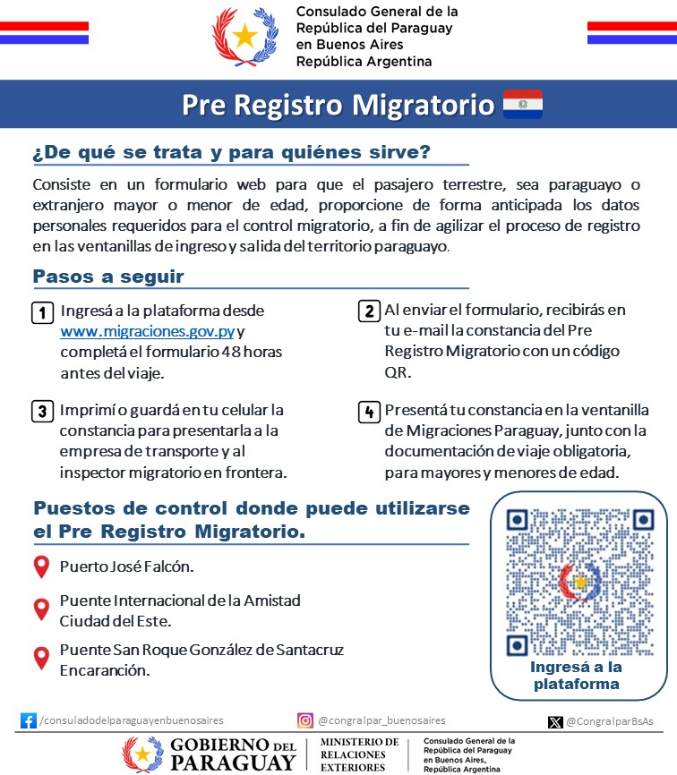 El Pre Registro Migratorio es uno de los trámites en línea implementados por el Gobierno del Paraguay en el marco de la Agenda Digital. El trámite fue lanzado a principios de diciembre de 2023, bajo la modalidad de plan piloto, dirigido a pasajeros de buses comerciales de transporte internacional y, tras la culminación de esta fase de prueba, la plataforma se habilitó a todos los viajeros que utilizan los pasos terrestres.