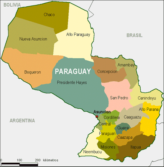 Al norte limita con Brasil y Bolivia, al este con Brasil y Argentina, al sur con Argentina y al oeste con Argentina y Bolivia.