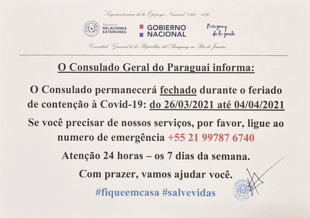 El Consulado General del Paraguay en Río de Janeiro permanecerá cerrado durante el feriado de contención al Covid-19: del 26/03/2021 al 04/04/2021. Si usted necesita de nuestros servicios, por favor, llame al número de emergencias + 55 21 99787 6740 (atención las 24 horas los 7 días de la semana). Con gusto, vamos a ayudarlo.