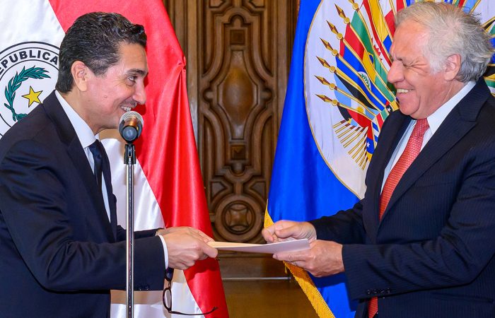 El nuevo representante permanente de Paraguay ante la Organización de los Estados Americanos (OEA), Raúl Florentín, presentó hoy sus cartas credenciales al secretario general del organismo, Luis Almagro, durante una ceremonia realizada en la sede de la Organización en Washington, DC.