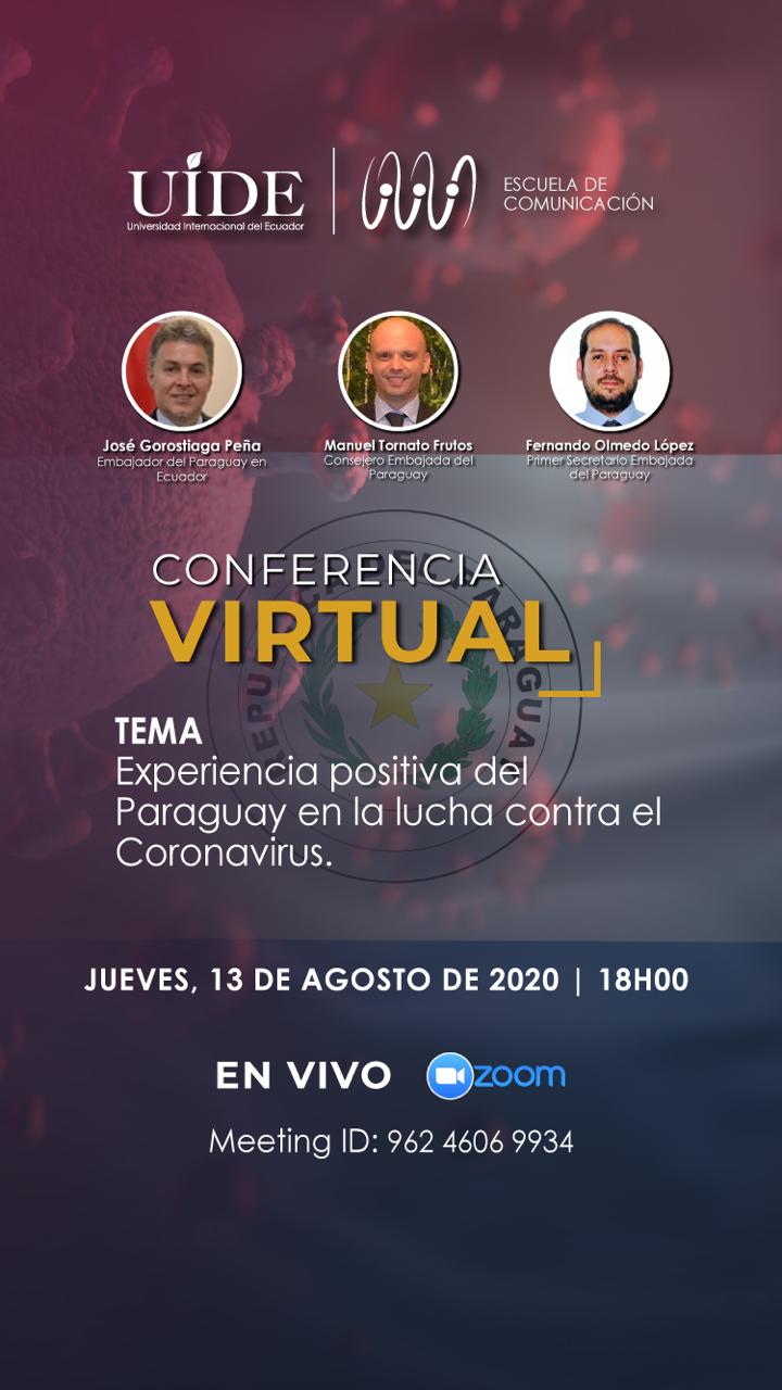 La Embajada de la República del Paraguay en Ecuador, en colaboración con la Escuela de Comunicación de la Universidad Internacional del Ecuador (UIDE), presentó la conferencia virtual “Experiencia positiva del Paraguay en la lucha contra el coronavirus”, dirigida a los docentes y estudiantes de la mencionada casa de estudios, con motivo del 483 aniversario de la fundación de Asunción. La conferencia se realizó en la plataforma Zoom, el 13 de agosto pasado.