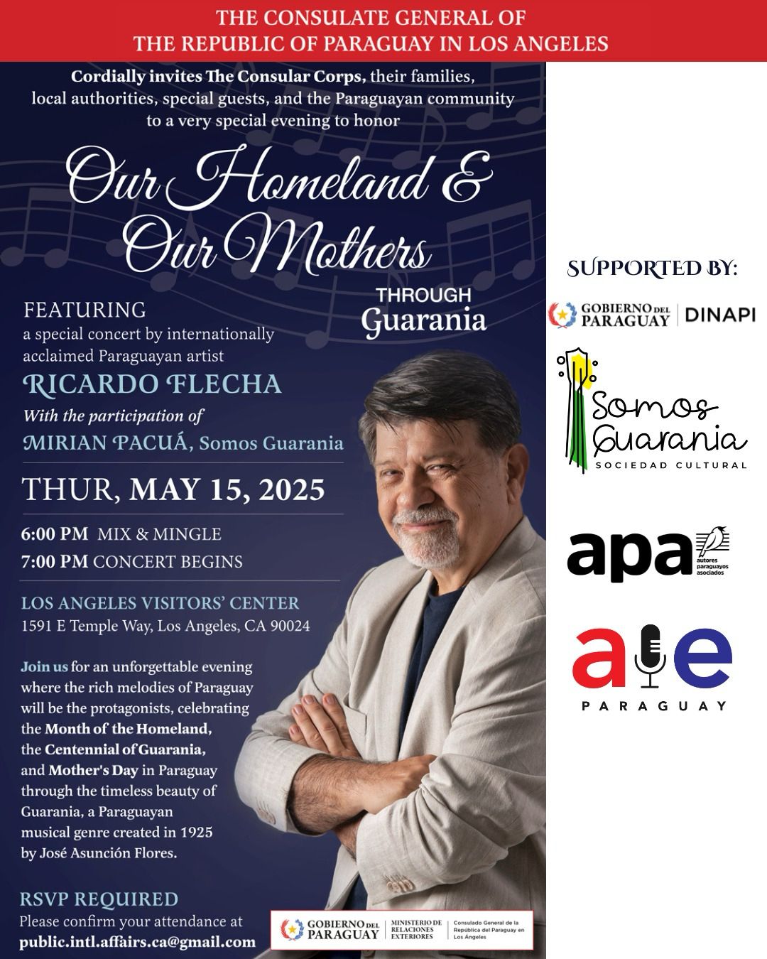 En el marco de los festejos por el Día de la Independencia Nacional y el Día de la Madre, y como parte de las actividades en homenaje a la Guarania, género musical recientemente declarado Patrimonio Cultural Inmaterial de la Humanidad por la UNESCO, el Consulado General de la República del Paraguay en Los Ángeles tiene el honor de invitar a un concierto exclusivo del reconocido artista paraguayo Ricardo Flecha.