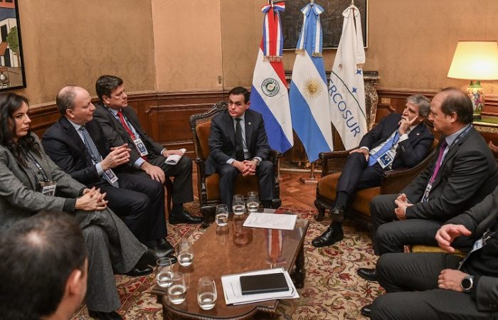 Durante la Cumbre del Mercosur, los ministros de Relaciones Exteriores, Rubén Ramírez Lezcano; de Industria y Comercio, Javier Giménez; y de Economía y Finanzas, Carlos Fernández Valdovinos, dialogaron con el ministro de Economía de Argentina, Luis Andrés Caputo, y la secretaria de Energía, María Tettamanti, respecto a la situación creada con el trasbordo de combustibles en el kilómetro 171 y coincidieron en la necesidad de encontrar una solución al tema.