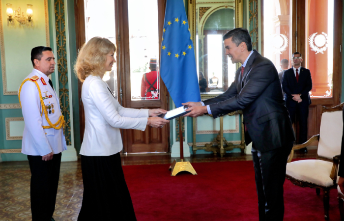 El presidente de la República, Santiago Peña, junto con el ministro de Relaciones Exteriores, Rubén Ramírez Lezcano, recibió esta mañana, en Palacio de Gobierno, las cartas credenciales de la nueva embajadora de la Unión Europea, Katja Afheldt.